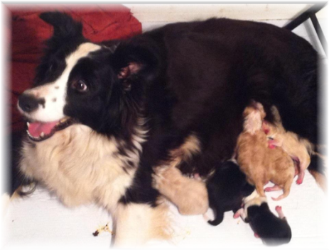 | The puppies made their debut late January 3, early January 4. We have 4 males and 5 females. In the litter we have 5 gold & whites and 4 black & whites. Mom and her babies are doing well. |