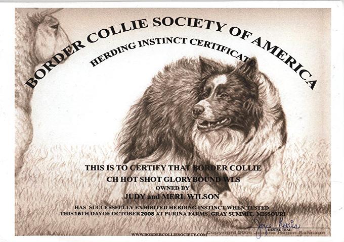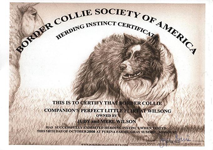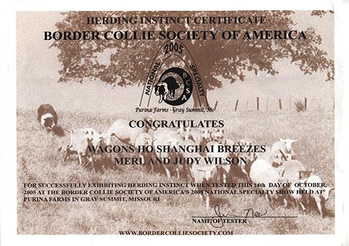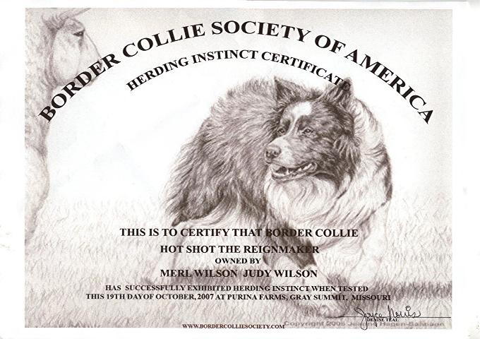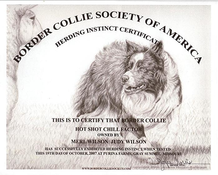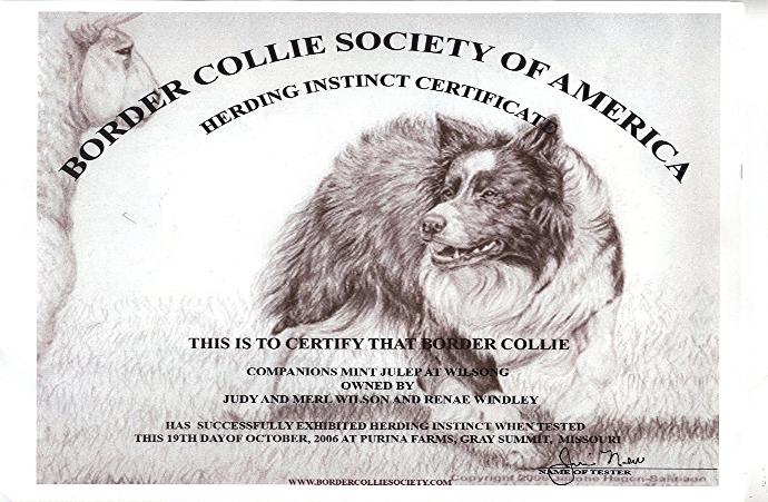 | Julee was 7 months old when she received her herding instinct certificate through the BCSA. At 9 months old she was tested by 2 different AKC herding judges to receive this certificate.A herding judge (Jim New) word to me were "She is a natural, now what are you going to do??" Julee is responsible for getting us into the herding arena. |