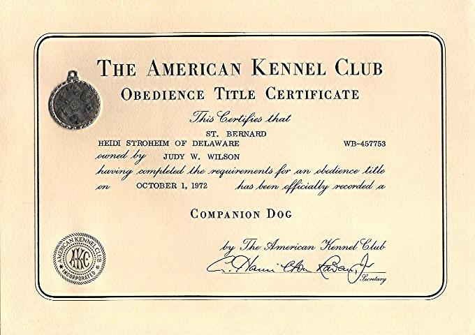| Heidi was my first St Bernard. After an incident where the neighborhood children had teased her, I learned how to train my own dog. Her & I had some great times together. We won a lot of obedience shows so I decided to show her in conformation, I soon realized, she was not a show dog. The other dogs looked a lot different than my St Bernard. But because of her, I was bitten by the show bug. This was my first award from the AKC. It was with my dear Heidi. She was a pet quality dog but, to me she was the most beautiful, loving and loyal St Bernard in the world. |