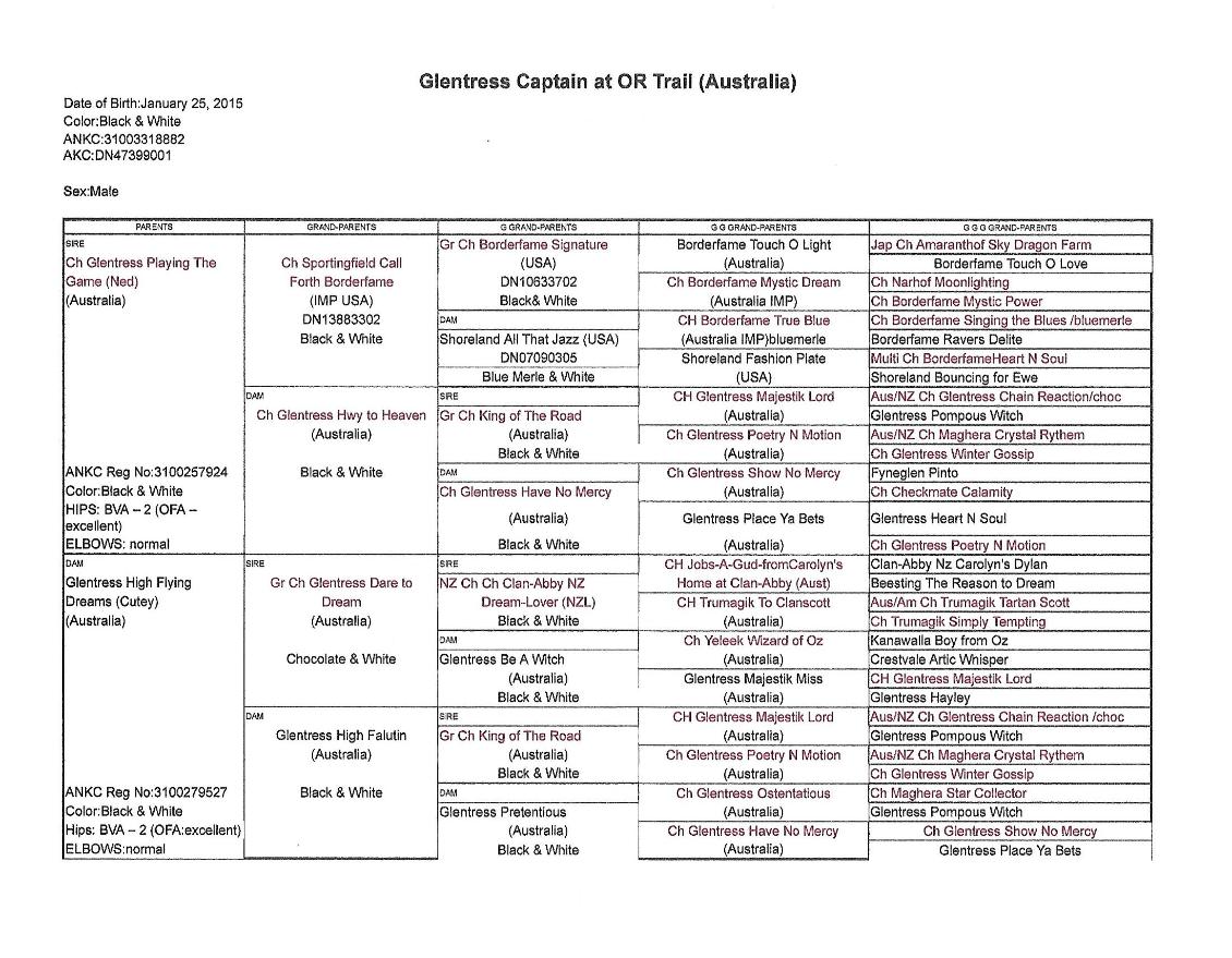 | Ch Glentress Playing the Game (Ned) ANKC 3100257924 Color: BLACK & WHITE | Ch Call Forth Borderfame | Gr Ch Borderfame Signature | Borderfame Touch O Light |