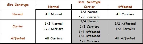 | SUMMARY Very briefly, CEA is a condition that affects the normal anatomy of the retina and other deeper structures of the eye, this can be irregularity in structure or even holes/pockets. In it's mildest form it will not affect the dog, in it's severest it will cause detached retina's/complete blindness. CEA is caused by a recessive gene which both parents must carry to produce affected pups. An animal will have 2 copies of every gene, one coming from the sire and one from the dam. If an animal has two normal copies of the gene, it is classed as 'normal' and cannot ever produce affected pups. If an animal has one normal gene and one defective gene it is classed as a 'carrier', mated to another animal with the defective gene it could produce affected pups. If mated to a 'normal' animal it will at worst produce more carriers but may also produce some 'normals' (Note: A carrier DOES NOT have the disease) If an animal had two copies of the defective gene it is classed as 'Affected' and will actually have the disease. If bred from, this animal can only produce carrier and/or affected pups. The table below shows the likely outcome of various matings.. The results shown in grey are what everyone wants to avoid...nobody wants to produce affected pups so these are the matings to avoid - carrier to carrier, carrier to affected, affected to affected. Prior to the introduction of a DNA test; eye testing was first carried out on pups at around the age of 6 weeks by one of only 30 BVA approved veterinarians around the country. This initial test is for CEA only and this period between 5 and 8 weeks of age is the best time for diagnosis of this condition. If a puppy is affected it is an indication that both of it’s parents are carriers of the CEA gene. While the Kennel club does not impose any breeding restrictions from affected dogs or carriers the International Sheepdog Society (ISDS) does not allow the registration of affected pups or their progeny and does not allow the registration of puppies by parents that have produced a CEA/PRA affected pup on more than one occasion (they allow one due to the possibility of a mis-mating). The ISDS is striving to eradicate this disease from the breed. Puppies that successfully pass this eye test are issued with a litter certificate. Passing an eye examinination at 6 weeks indicates the puppy is not AFFECTED by the disease but the physical examination cannot tell you which puppies are carriers of the gene. The recent introduction of DNA testing for the CEA gene by American laboratory, OptiGen has revolutionised breeding of border collies to a certain extent...although it can be quite expensive, we can now DNA test all breeding stock to see which animals are affected, which are carriers of the gene and which are DNA 'normal'. This means there need never be any more affected puppies produced...we can ensure that by breeding carrier/affected animals to 'normal' animals the puppies cannot ever be affected by the disease. Since this test first became available in January 2005, ALL our dogs used for breeding are DNA tested in this way. |